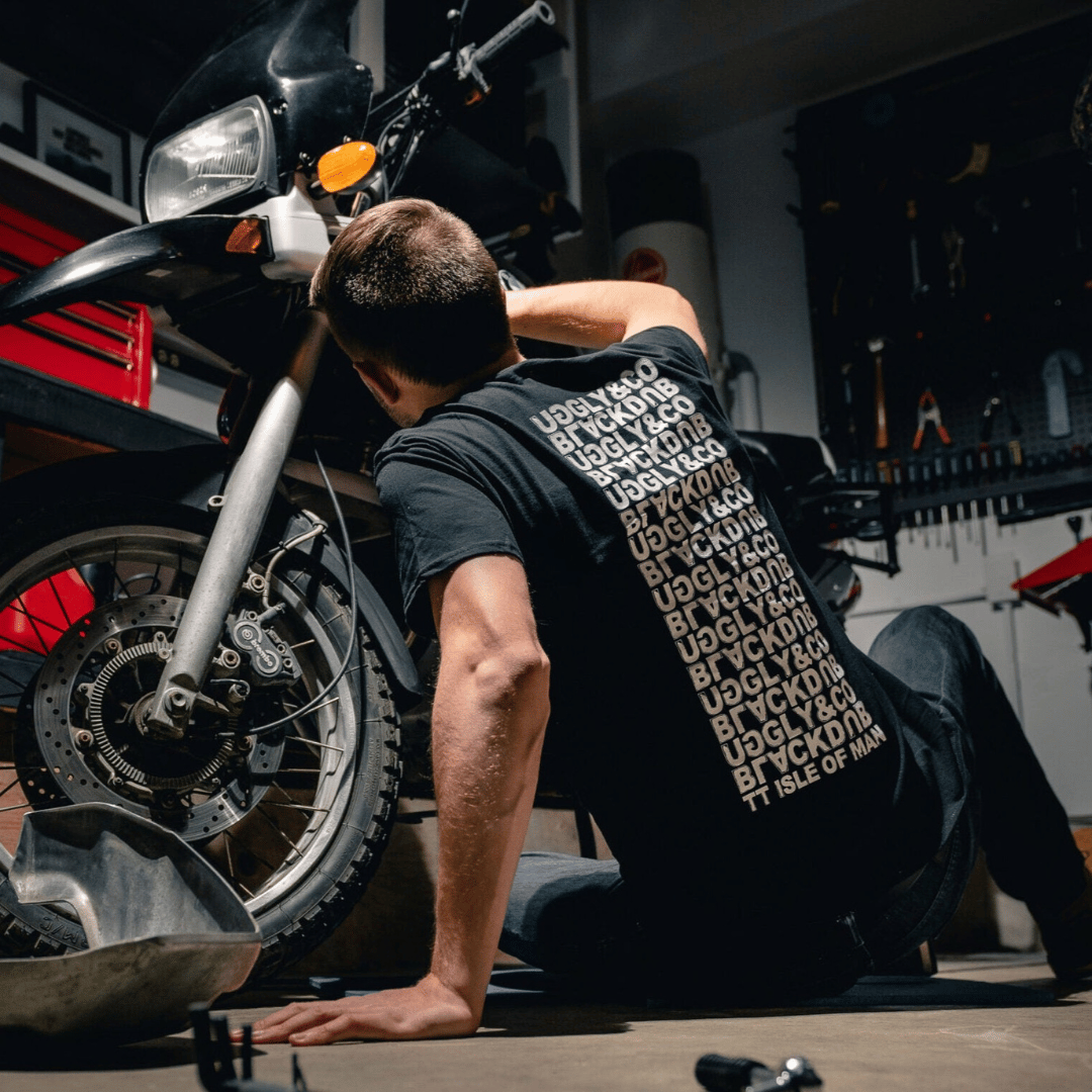 The Repeat Tee, is part of The Black Dub Collection. With inspiration taken from The Black Dub, Mile 9’s roots of a Motorcycle Garage & Petrol Station situated on mile 9 of the infamous Isle of Man TT Course. Mile 9 is a historic section of the TT Course with corner after corner of damp, off camber, blind, bumps. Its a challenging, technical, and very fast part of the course.